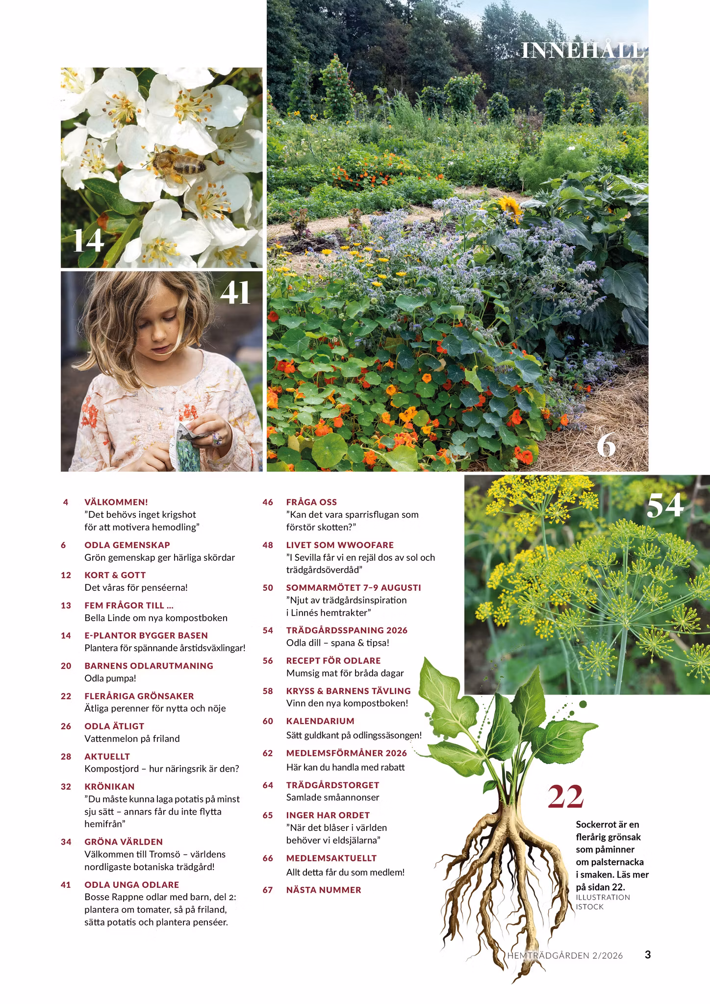 Fleråriga grönsaker, vattenmelon på friland, e-märkta buskar och träd som förgyller årstiderna och en djupdykning i kompostjordens näringsinnehåll är några av höjdpunkterna. Det blir också besök i odlarföreningen Tillsammans i Mölndal och världens nordligaste botaniska trädgård i norska Tromsö.